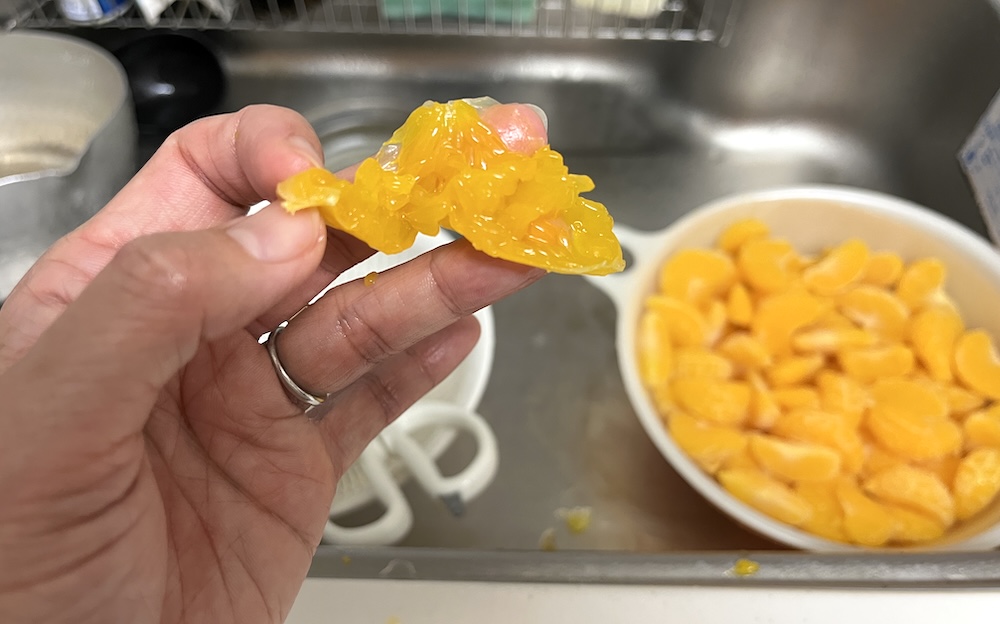 はい、薄皮が邪魔すぎて、とても缶詰みかんとは言い難い出来…。