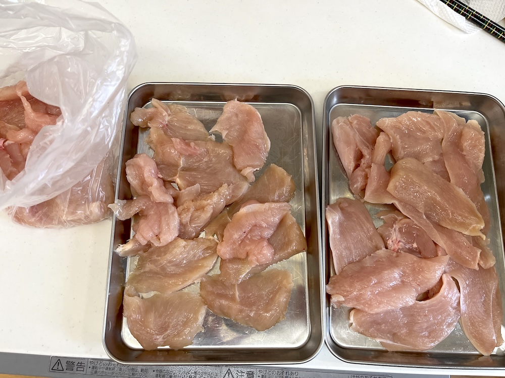 朝食を準備しながら、鶏胸肉を削ぎ切りにしておく。
