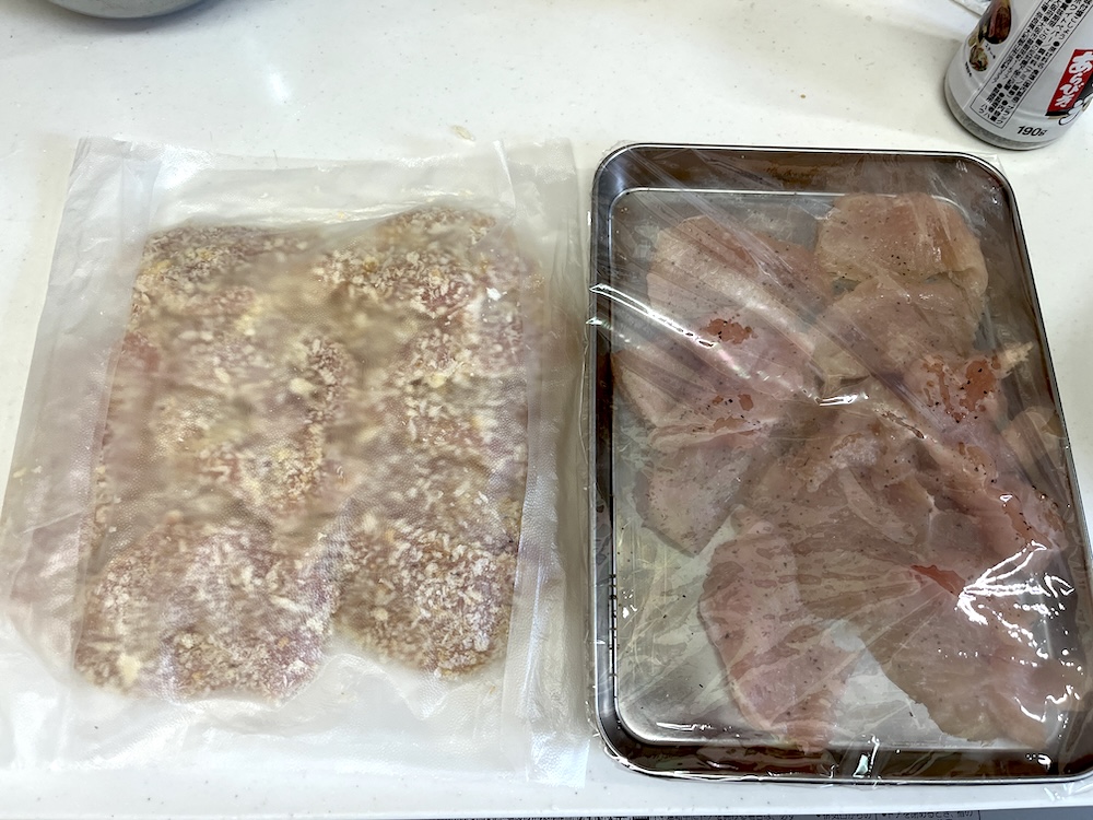 右:ピカタ用に塩コショーをして冷蔵庫へ(その日の夕飯用)