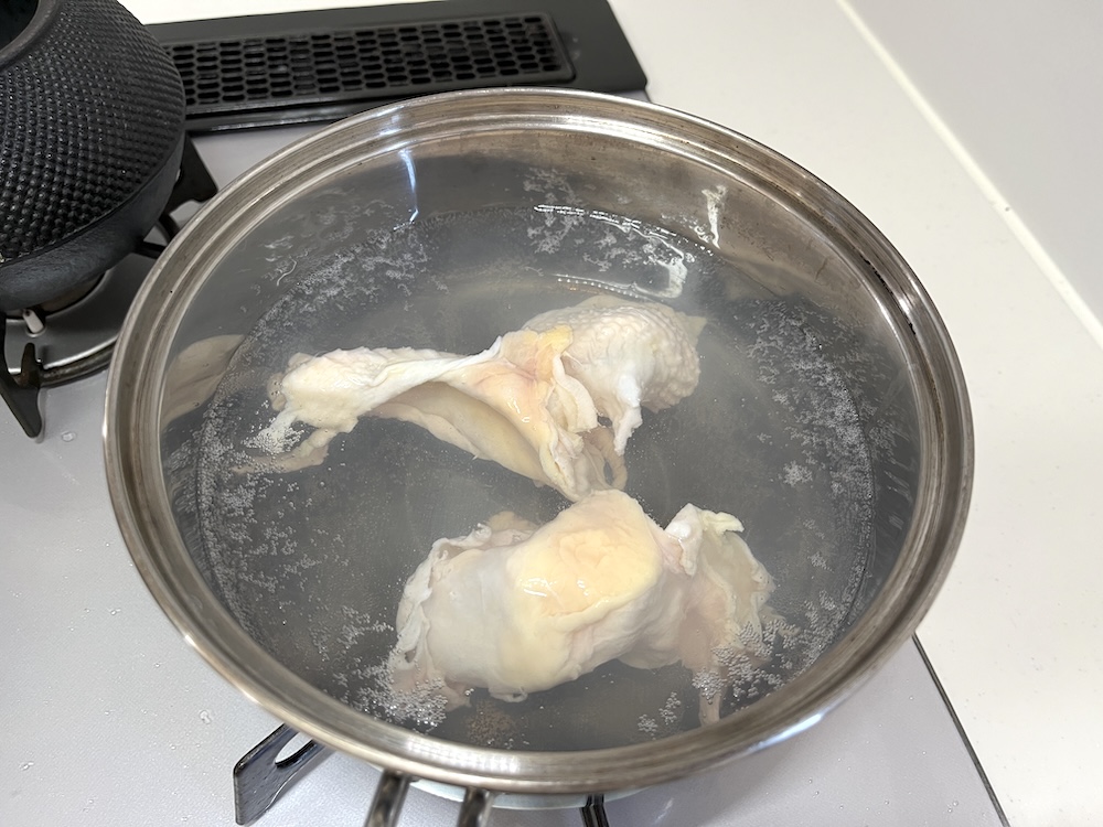 出汁をとった鶏皮は、お湯から取ったあとは粗熱取ってラップして冷蔵庫へ。